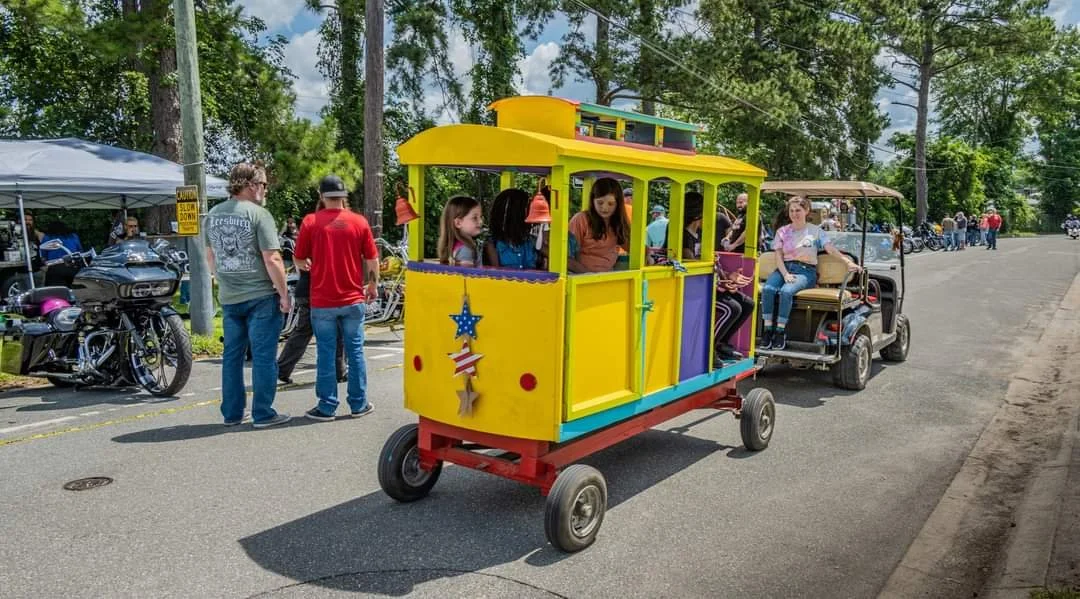 Our custom made trolley is perfect for children ages 9 and under to ride on. It features two bench seats and two individual seats for total seating of up to 8 children at once. It is pulled by a golf cart with our “conductor” in the drivers seat. Our trolley is licensed and insured. We also provide fun, family-friendly music and instruments to play while they ride.